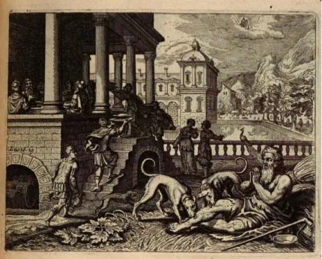 De rijke man en Lazarus, naar een gravure van Pieter Schut naar Matthaeus Merian, ca. 1580. Deze prent heeft als grafisch voorbeeld gediend voor de voorstelling op het hakkebord.