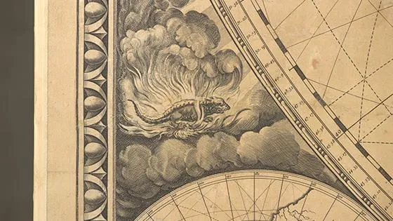 Je kent ze vast: water, vuur, lucht en aarde. Elk sterrenbeeld valt in een van de vier elementen. Joan Blaeu heeft in de Wereldkaart verschillende dieren afgebeeld die corresponderen met een van de elementen: een walvis (water), adelaar (lucht), een brandende salamander (vuur) en een mol (aarde). Hierbij een illustratie van het vuurteken.