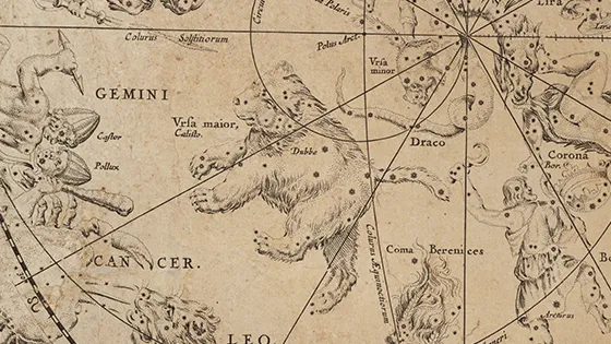 Deze twee kunnen niet zonder elkaar. Vroeger werden hemelglobes vaak gemaakt samen met een aardeglobe. Ook op deze kaart was het belangrijk het universum te schetsen. Blaeu schetste in de bovenste hoeken van de kaart de hemellichamen op het noordelijk en zuidelijk halfrond. Omdat er minder kennis was over de hemellichamen die zichtbaar waren op het zuidelijk halfrond, zijn die minder vertegenwoordig. Een van de bekendste sterrenbeelden is natuurlijk de Grote Beer. Blaeu maakte een schitterende tekening van dit imposante dier.