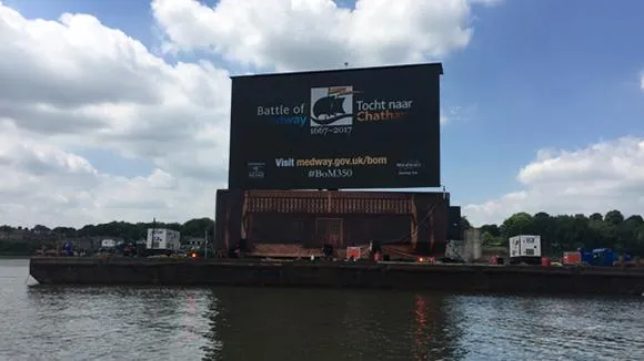 Op grote schermen in de rivier wordt het verhaal van de battle of the Medway vertoond voor het publiek.