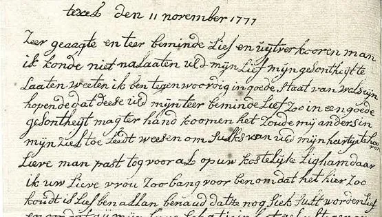 ’Lief, wees verseekert dat ik uw getrouw zijn en van harten lief heb. Ik ben daar ten uijterst van verseekert dat gij mij ook lief hebt en getrouw zijt, zoo als gij mij ook belooft heb en daarom komt het niet eens in mijn gedagten dat gij iets doet dat mij niet souden behagen, ik vertrouw uw wel op uw woord lieve man’.