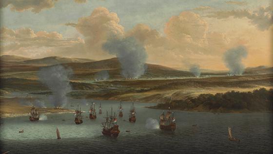 Dit schilderij valt nogal op in de zaal van Het Scheepvaartmuseum in het DWDD pop up museum. Met een lengte van meer dan vier meter en bijna twee meter hoogte springt dit werk in het oog. Wellicht valt het je direct op: op dit schilderij zie je geen Nederlandse schepen. Waarom eigenlijk niet?
