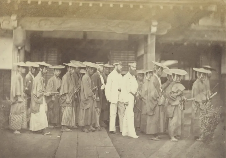 Groepsportret met Dirk de Graeff van Polsbroek, kanselier J.P. Metman en J. Bloem te midden een Japanse escorte, 1863, Felice Beato / Collectie Het Scheepvaartmuseum, Amsterdam