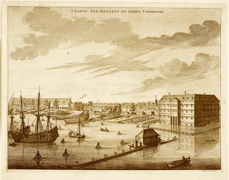 's Lands Zeemagazijn met de timmerwerf, 1700, Joseph Mulder